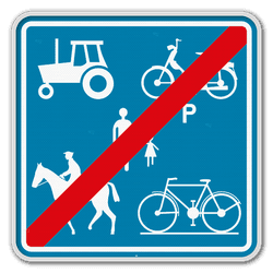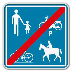 Fin du chemin réservé à la circulation des piétons, cyclistes et cavaliers avec l’indication de la partie du chemin qui est affectée aux différentes catégories d’usagers